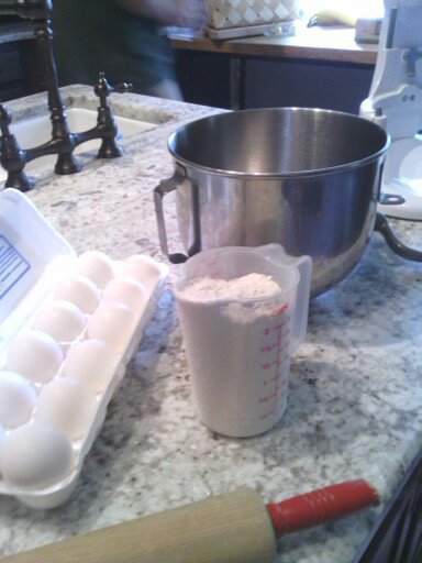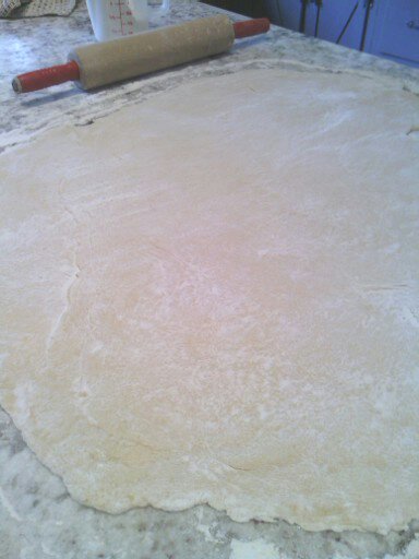 Mix the eggs, adding flour a cup at a time until it is still somewhat sticky (because you will be adding more as you roll it out)…You can roll it out onto newspaper or right on the counter like I did in theses pictures. Greg’s mom has a FABULOUS! kitchen and she never complains when the girls and I make messes and use it as a test kitchen! She is very easy going. One time I completely re-arranged her entire pantry and even Savannah began to get a little impatient with me as I sorted and plotted where to put things. I had the entire kitchen and dining room in disarray one Saturday…Anyway, spread about a cup on the surface and begin rolling it out.