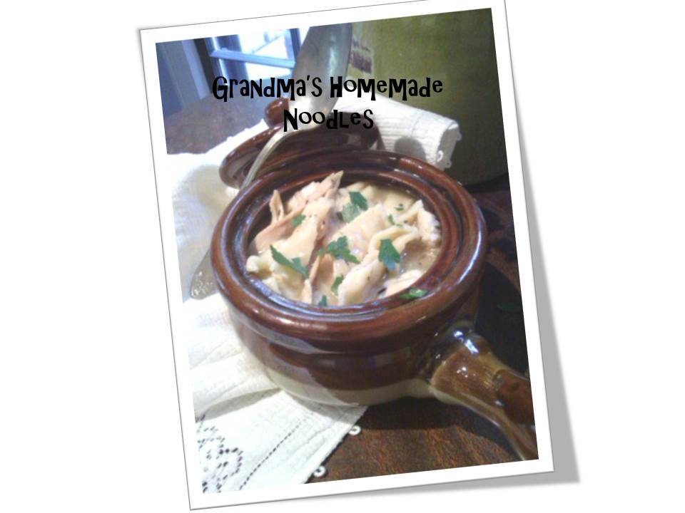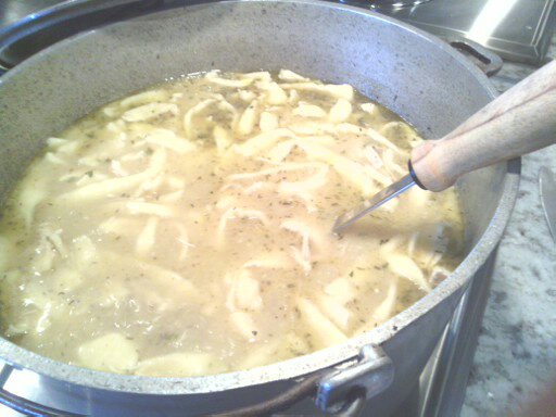 First make the noodle dough so it can dry. While your dough is drying, begin the broth…Place the cleaned chicken in a large pot and fill with water (just enough to cover chicken) You can also add a stalk of celery and a small cut up onion for added flavor in your broth then remove it when you go to pull the meat off the bone. Once the chicken is cooked. Turn off the burner and let it cool a bit. Once cooled remove the chicken and set aside until it is cool enough to take the meat off. At this point, your noodles have been drying nicely. After rolling and cutting the cute noodles so they can dry a little more, you can turn the pot of stock back on (med heat). Add the box of chicken broth, can of cream of chicken soup, herbs, bullion cubes and lemon pepper. Pull the meat off the bone and add the chunky pieces of chicken to your broth. Finally, 30 minutes or so before serving time, bring the broth to a boil and slowly stir in the floury noodles. They will take about 20 minutes to cook through depending on the thickness of the noodle. Add salt and pepper to taste. Enjoy!!
