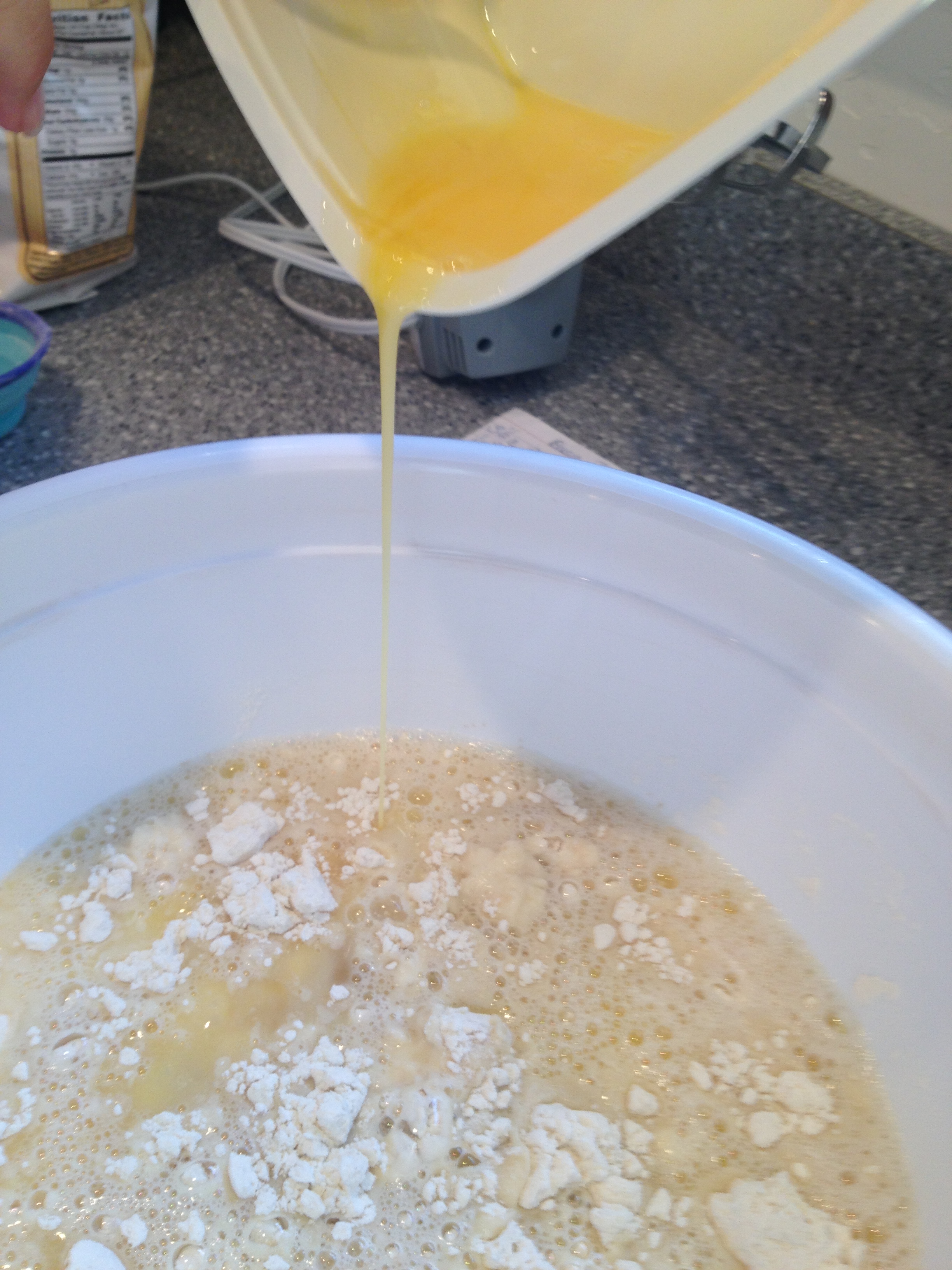 Pour the warm liquids into your mixing bowl.
