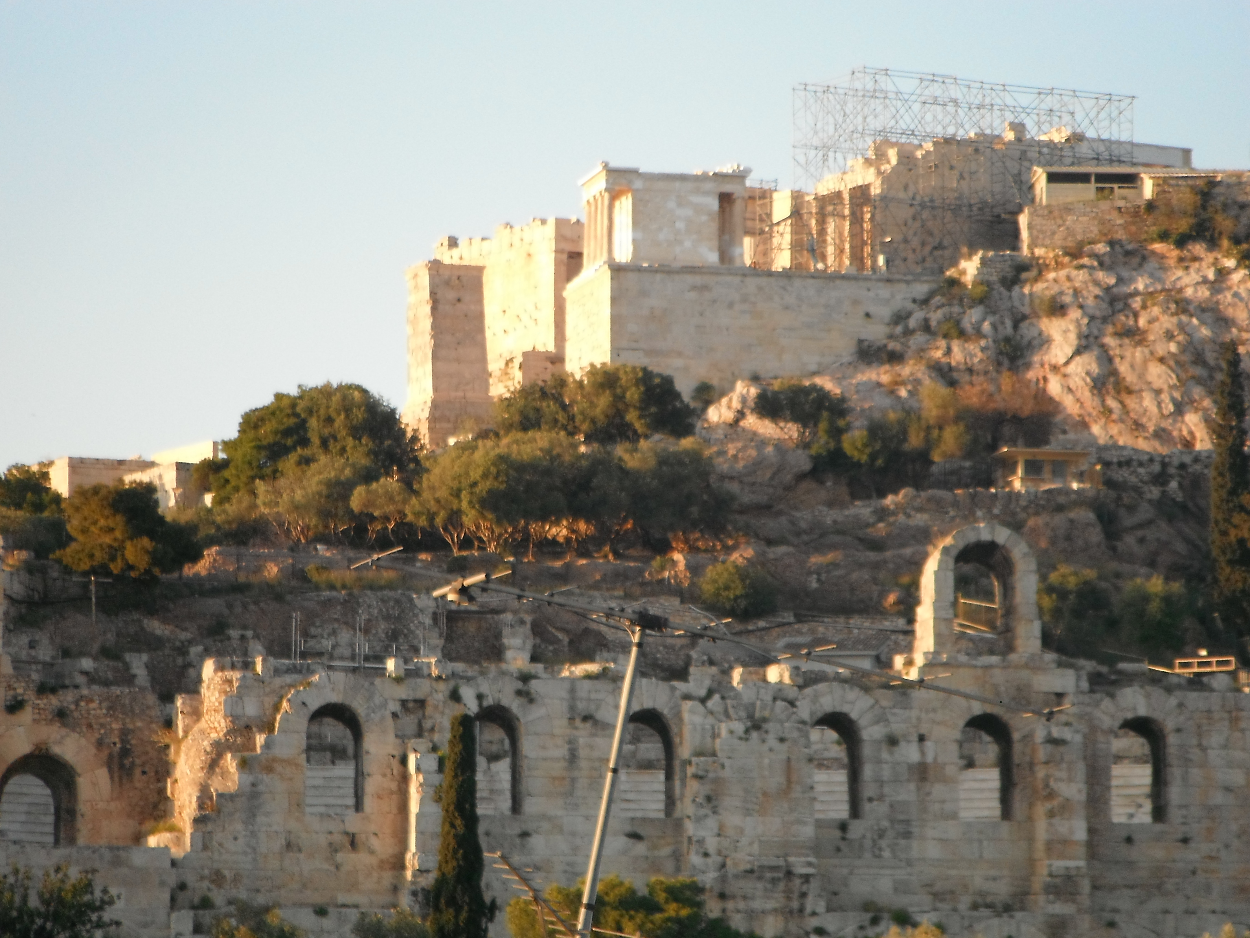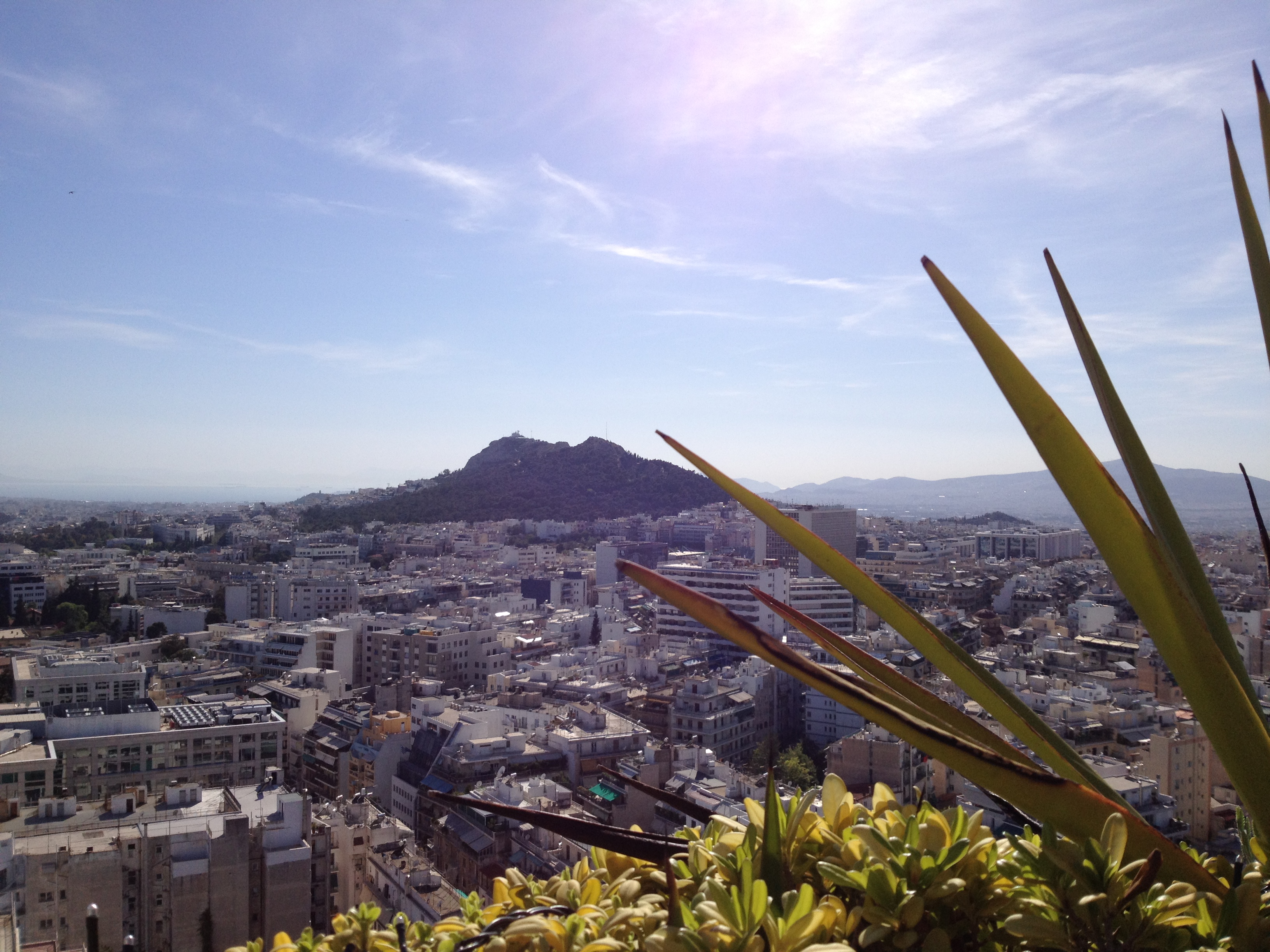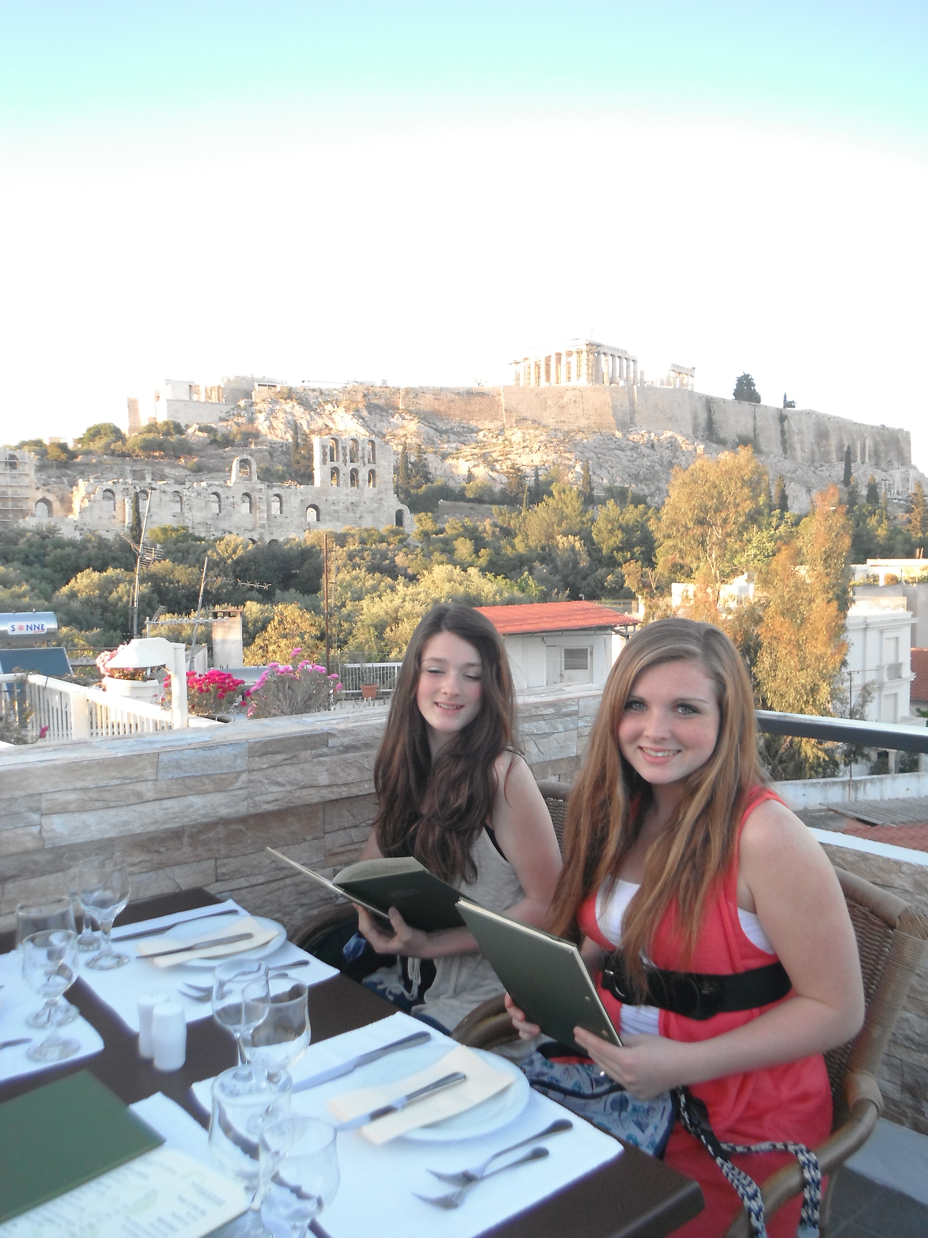 After a shower and some zzzzzzzs, we awake this morning and look at this city in a whole new way. This Hotel is perfect! The staff is agreeable and attentive. Today we will walk around a bit and see if we can find some needed items which could not fly with us. We must see The Acropolis and find a lovely place to have dinner, but first….ROOM SERVICE. We slept a little late and missed the complimentary breakfast. From our rooms on the 9th floor, we see little children playing in the school yard below. If we go too far from the Hotel today, we will be taking a cab. About a block down is a big supermarket type store, where we are approached by a lovely young woman trying to sell us caffeine pants, which are like spandex that you put on, and they evidently help with weight loss. The people are extremely friendly… The maid taught the girls a nice Greek term “zesty” which means hot…or they think that’s what she said as they fiddled with the air unit.