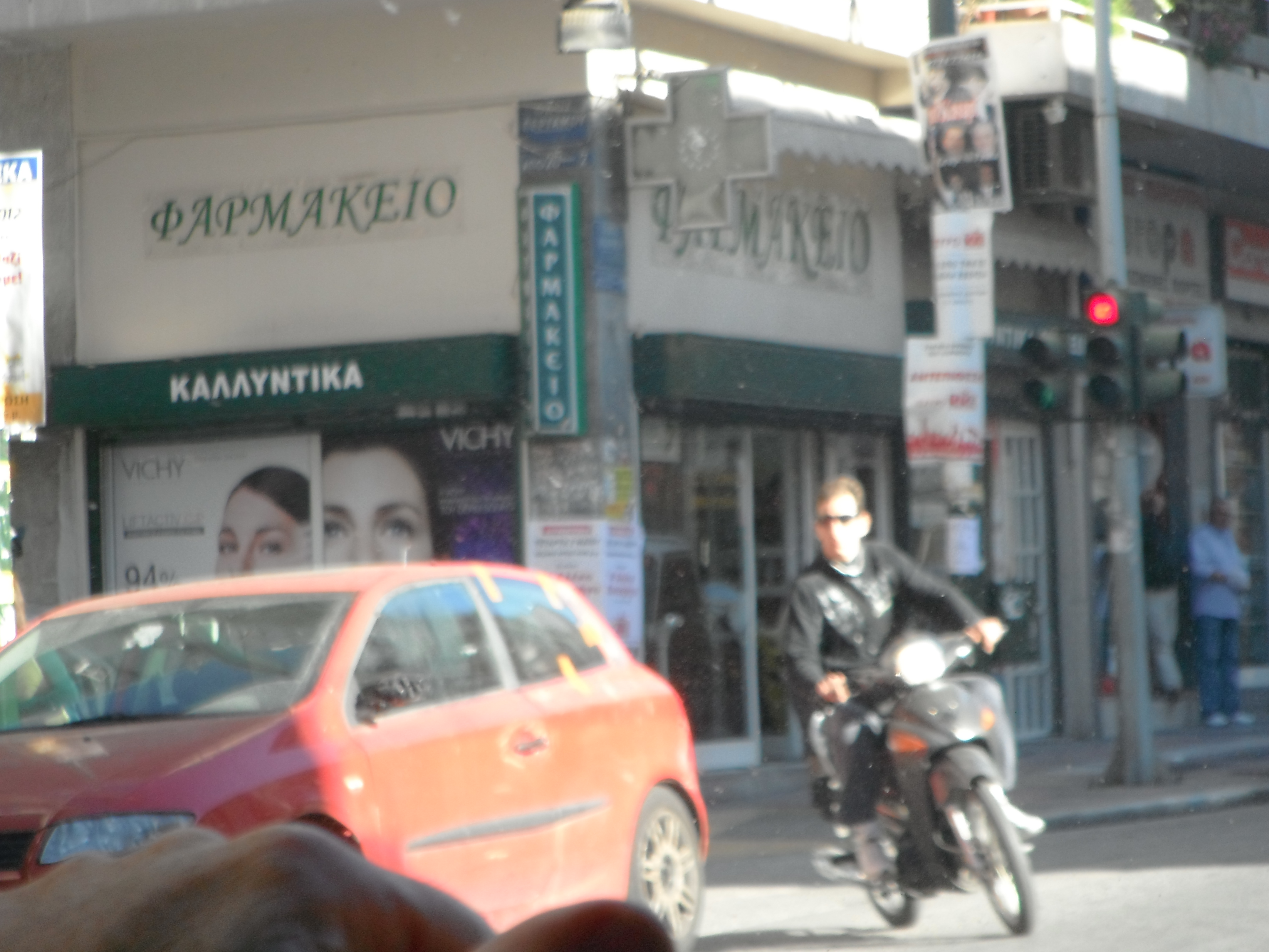 It will be dark soon. Greg shifts and jerks the economy size rental car as I frantically attempt to read this map which, naturally is not in English (hence the phrase “It’s all Greek to me”) We are weaving through this very busy city searching for road signs that don’t exist, and those that do are in Greek and blurry as we whiz by. Driving in Greece seems to be slightly different than America. Greeks don’t worry so much about lanes and stop lights. I feel like it’s a free-for-all, especially with all the motor scooters turning 3 lanes into 6 or 7. Hey, that looks like a great shoe store!