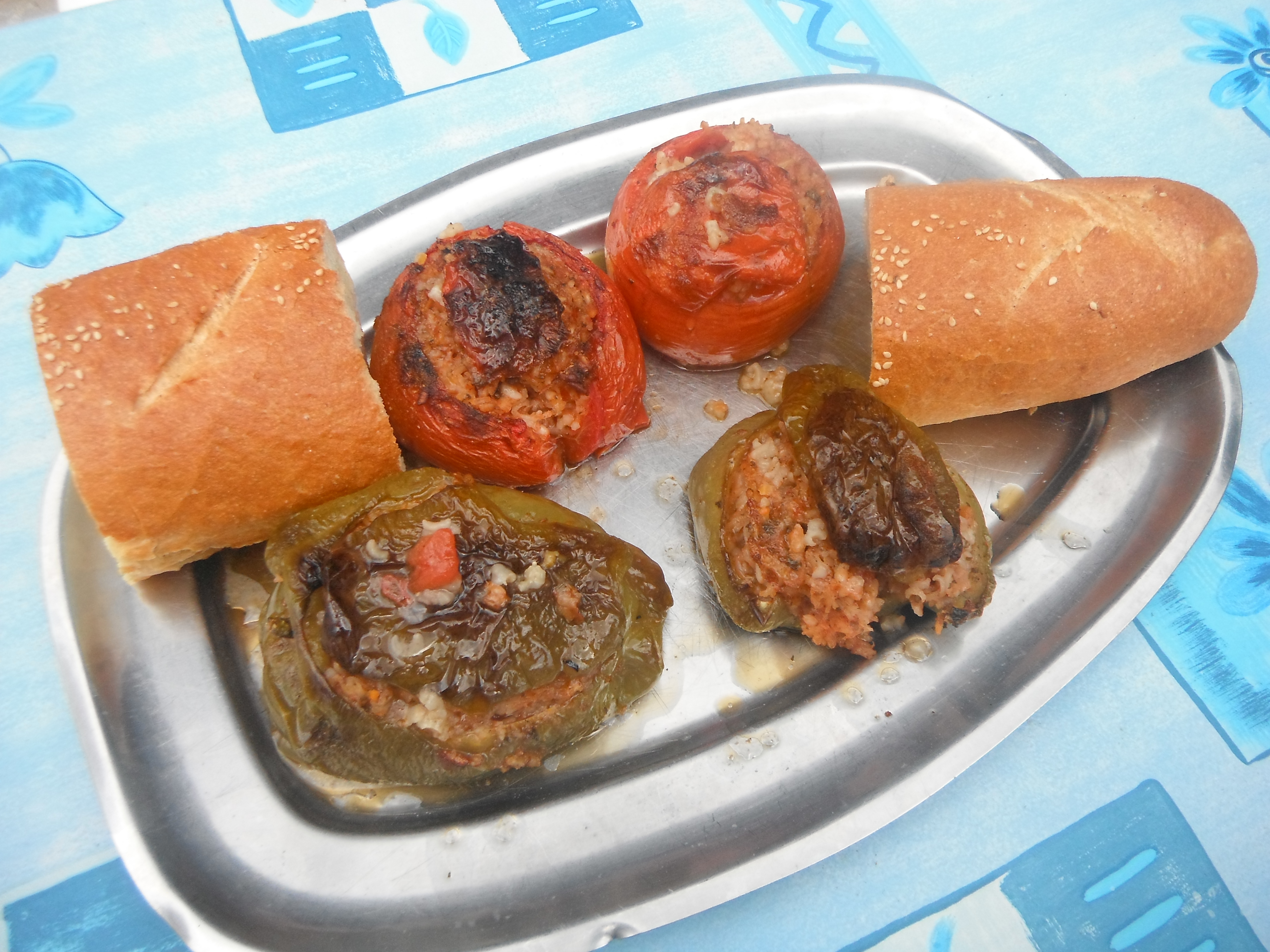 Before she taught me the recipe, we made some stuffed tomatoes of our own in our bungalow kitchen. Growing up my mother always made “Stuffed Peppers with Spanish Rice”. It includes ground beef and Italian herbs while greek stuffed tomatoes is meatless and has light fresh minty flavors.