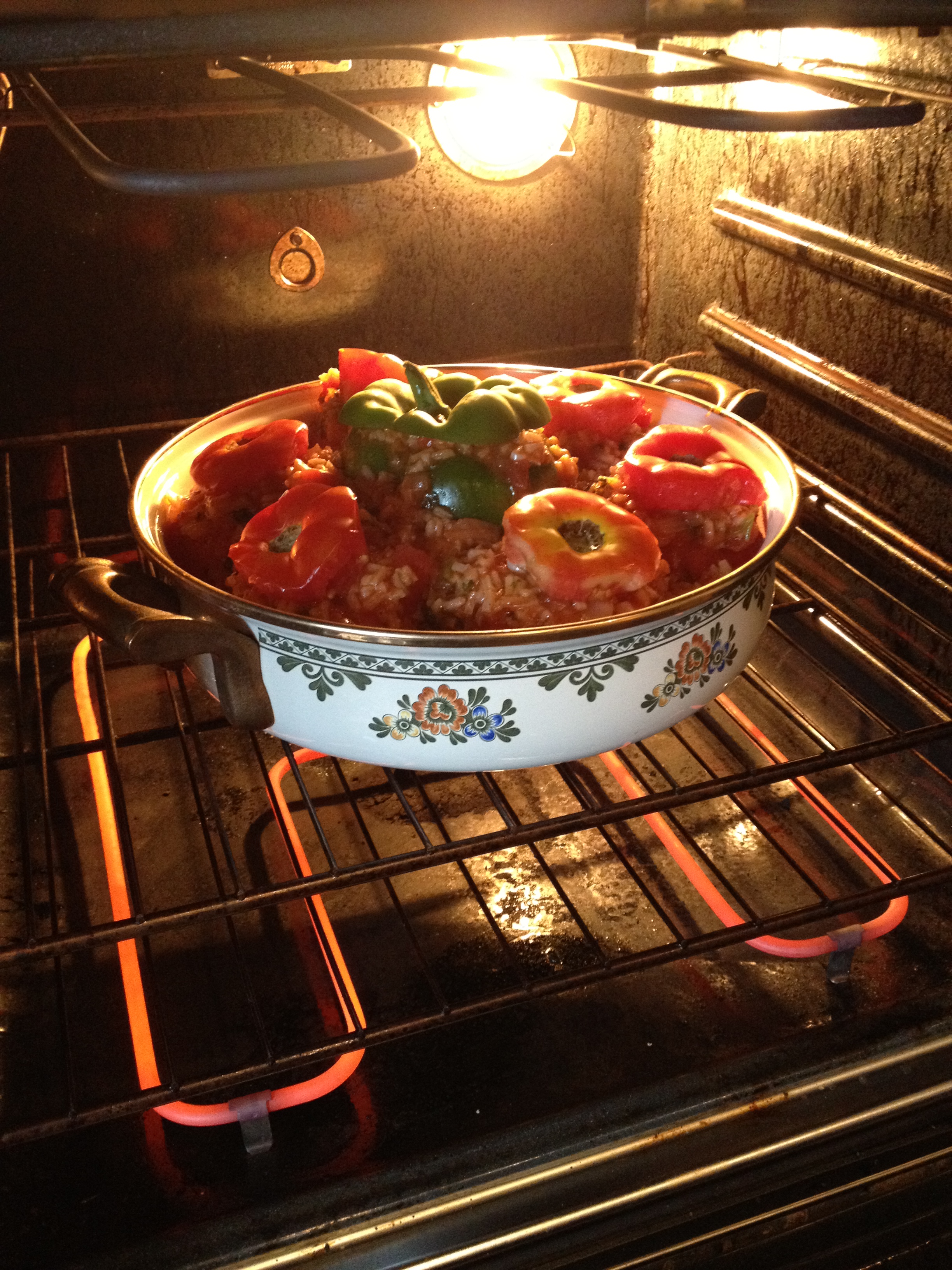 Preheat oven to 350. Prepare the tomatoes and bell peppers by cutting off the tops (set aside for use later) Remove inner flesh. Place the tomatoes and peppers in an oiled baking dish. Sprinkle the insides with sugar, salt and pepper. Meanwhile, combine orzo, garlic, 1/2 cup olive oil, tomato sauce and stewed tomatoes in a saucepan and bring to a simmer. Turn off heat and stir in fresh herbs and parmesan. S & P to taste. Fill the tomatoes and peppers with the mix. Put the tops on (you saved them)… Pour the water in the bottom of the baking dish. Bake for 45 minutes or until they begin to bubble and sizzle! Now turn on your broiler for just a minute just to brown the top (Watch it!) Remove from oven, place on serving platter and drizzle with olive oil.