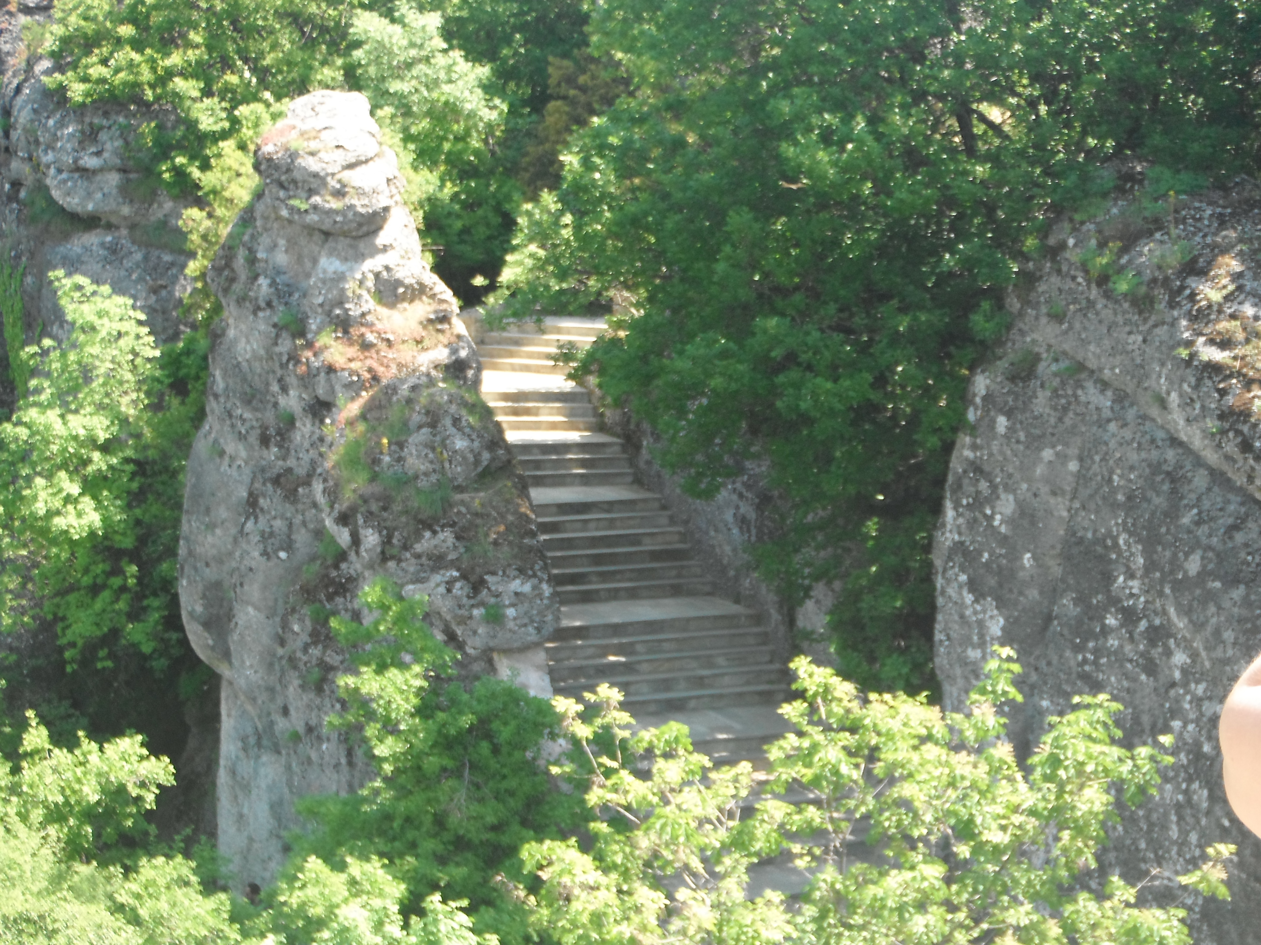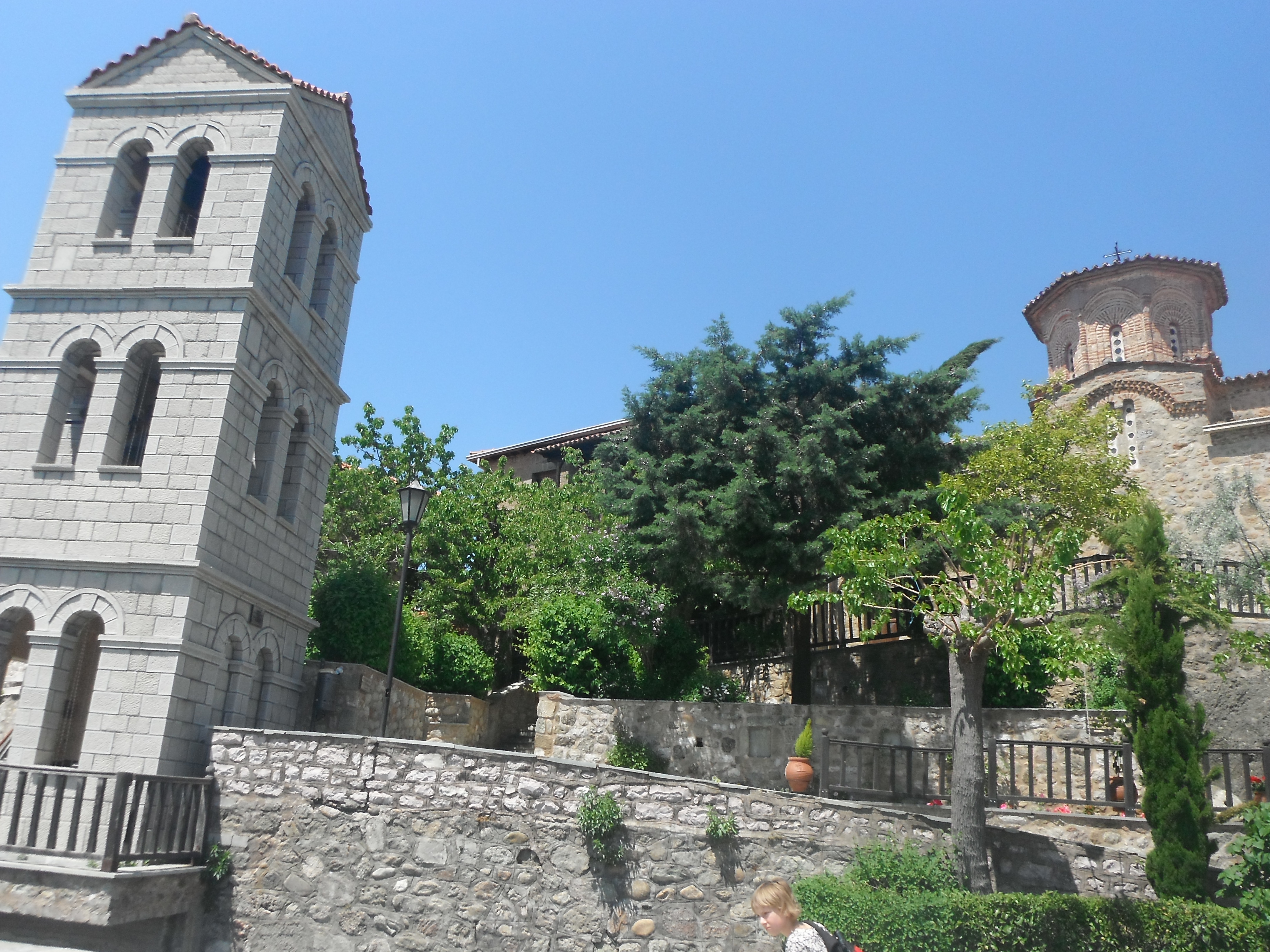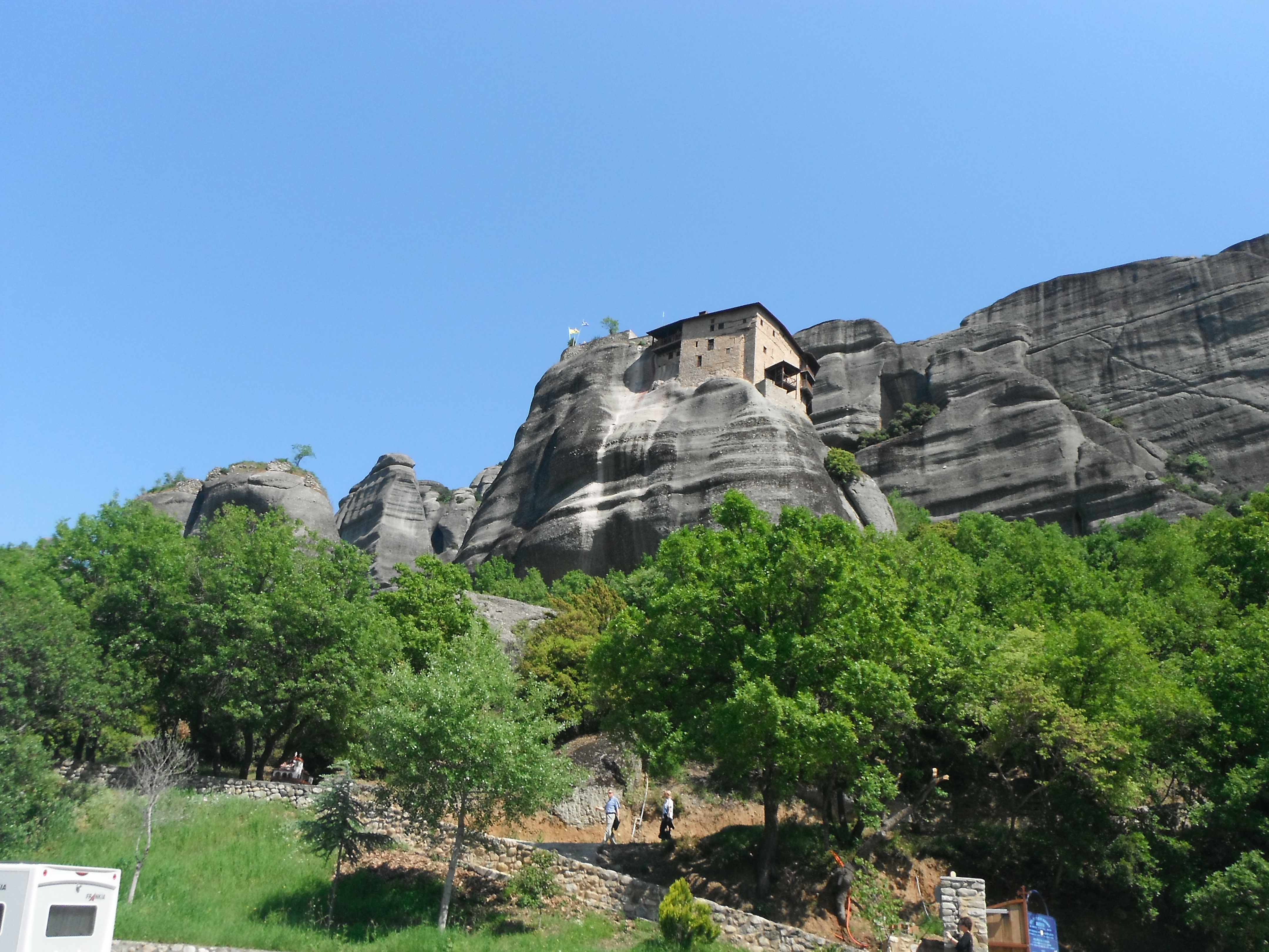 The Village of Kastraki is located just outside Kalampaka or Kalambaka, a slightly larger city of 15,000 people or so. Things are blooming like crazy now and the youngest seems to be experiencing some pesky allergies. We find a pharmacy and seek the advice of a professional , who somehow understands our problem and ushers us over to the shelf where she hands us a box. Feeling somewhat hesitant because of my inability to read the box, Greg shrugs and reassures me the box says zyrtec, in Greek naturally. We present the pill to Charlotte, “Here ya go, Kid. Give it a try.” There is only about a billion olive trees in this country! After two nights, we have decided to stay two more. Fortunately, there is no rush and this affords us more time to visit monasteries. At 18, Savannah can enjoy a glass of wine here in Greece, but waiters seem to think both girls are 18 ? Adapting to life without hairdryers is simple for our lovely redhead. She has discovered braiding her intense mane and sleeping in it provides a whole fresh look. Nice, huh? Dad is not so sure.