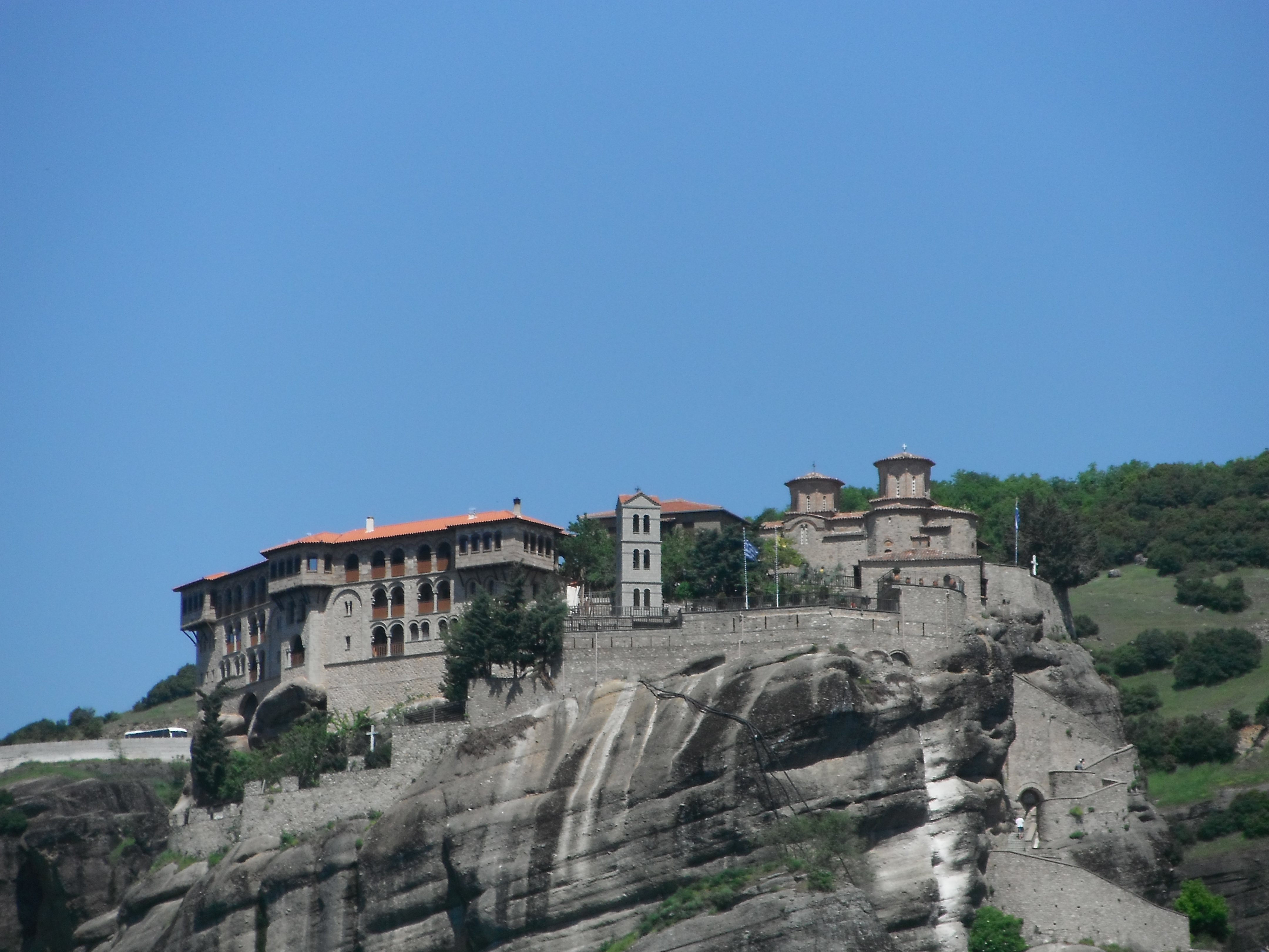 After enjoying a complimentary breakfast feast on the lower level of The President Hotel, we checked out of our rooms on the 9th Floor and rolled our bags out to the parking garage where our trusty economy sized rental car sat waiting minus one hubcap, of course. The night before I studied the route to Meteora online and for 2 hours, I jotted down detailed instructions in my spiral notebook, so we would be able to locate our next destination. We definitely didn’t want another situation like we had upon arrival … So, with notebook on my lap displaying my fine Navigational scribbles in both Greek and English, Greg was able to drive us easily out of the busy city of Athens and north towards Trikala. Roads in Greece are rather nice. Major highway and city signs are clearly labeled and once you get familiar with spotting them, it becomes a lot of fun!