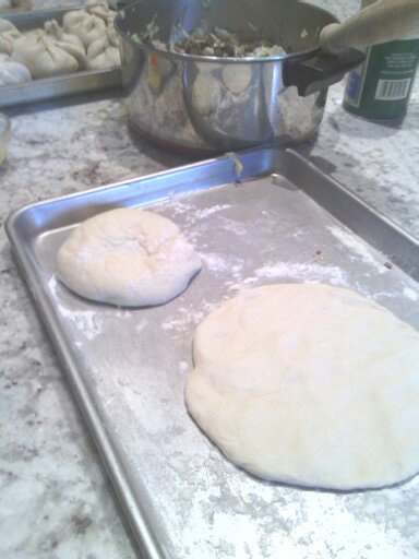 Place a scooper full of the meat and cabbage filling in the center of a flattened circle of dough.
