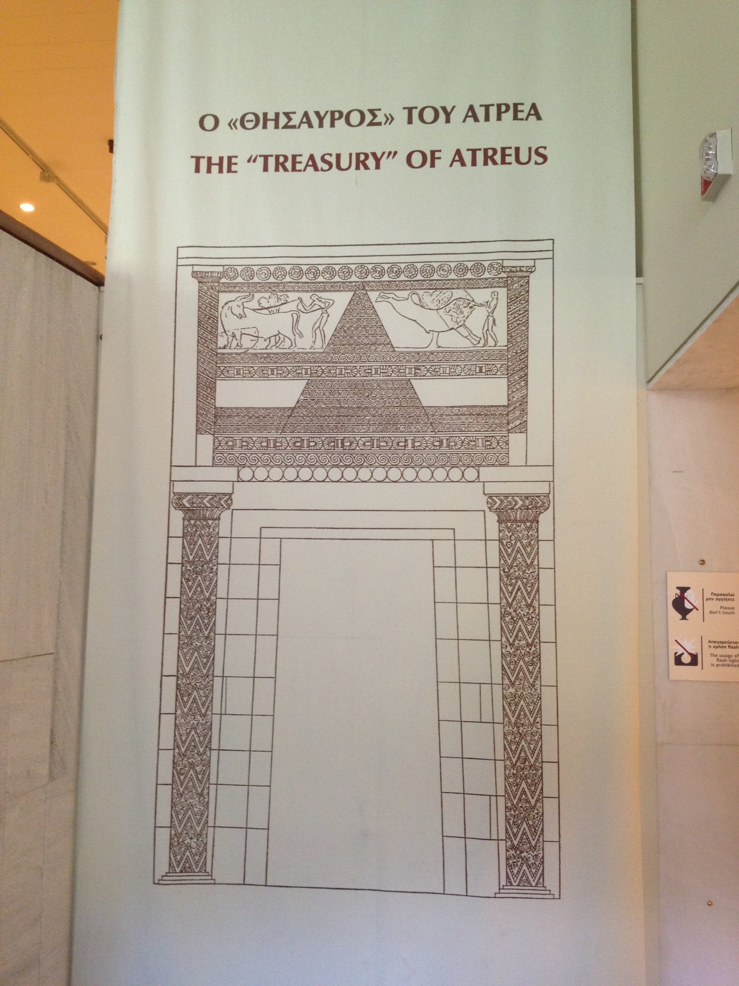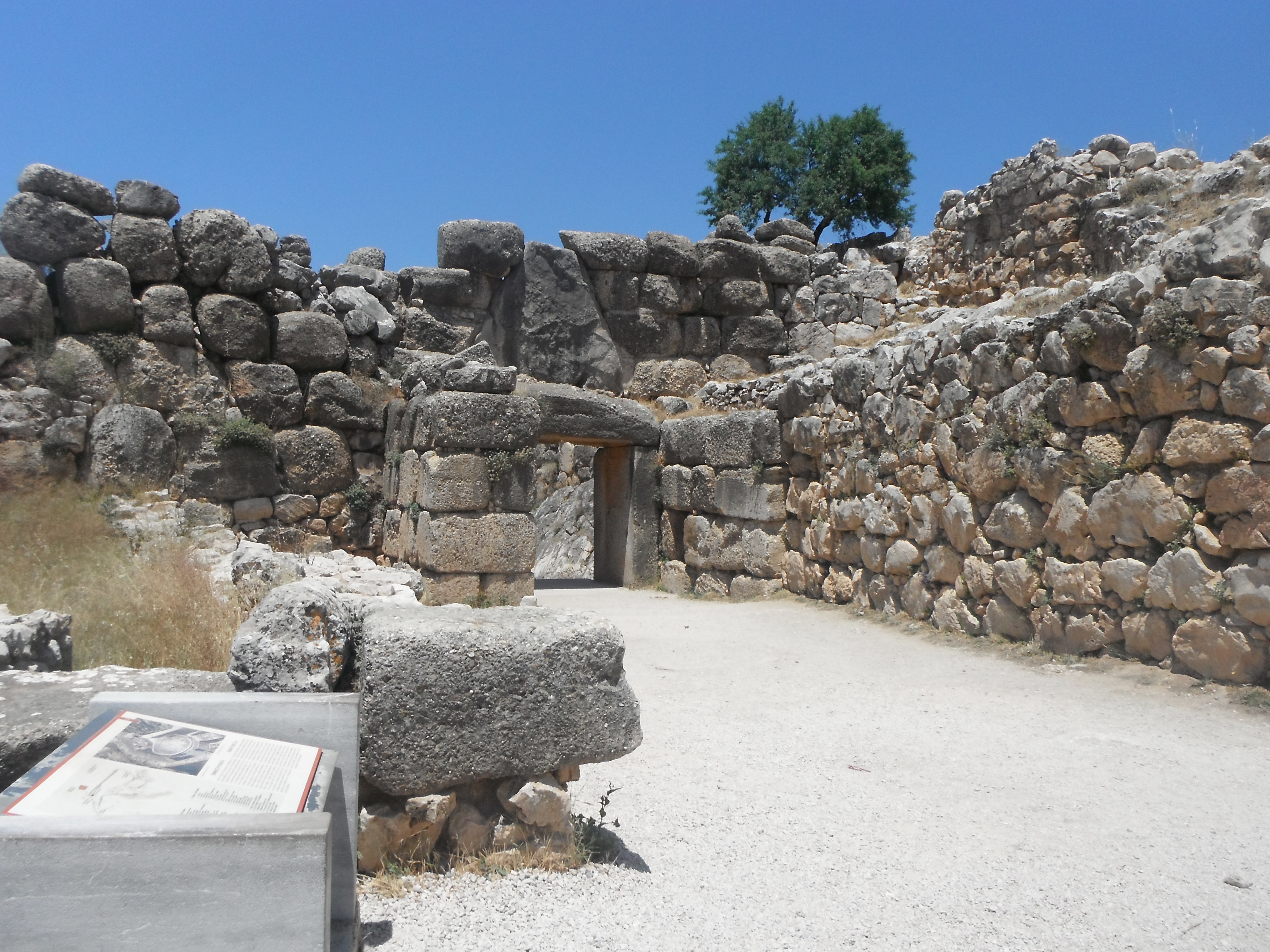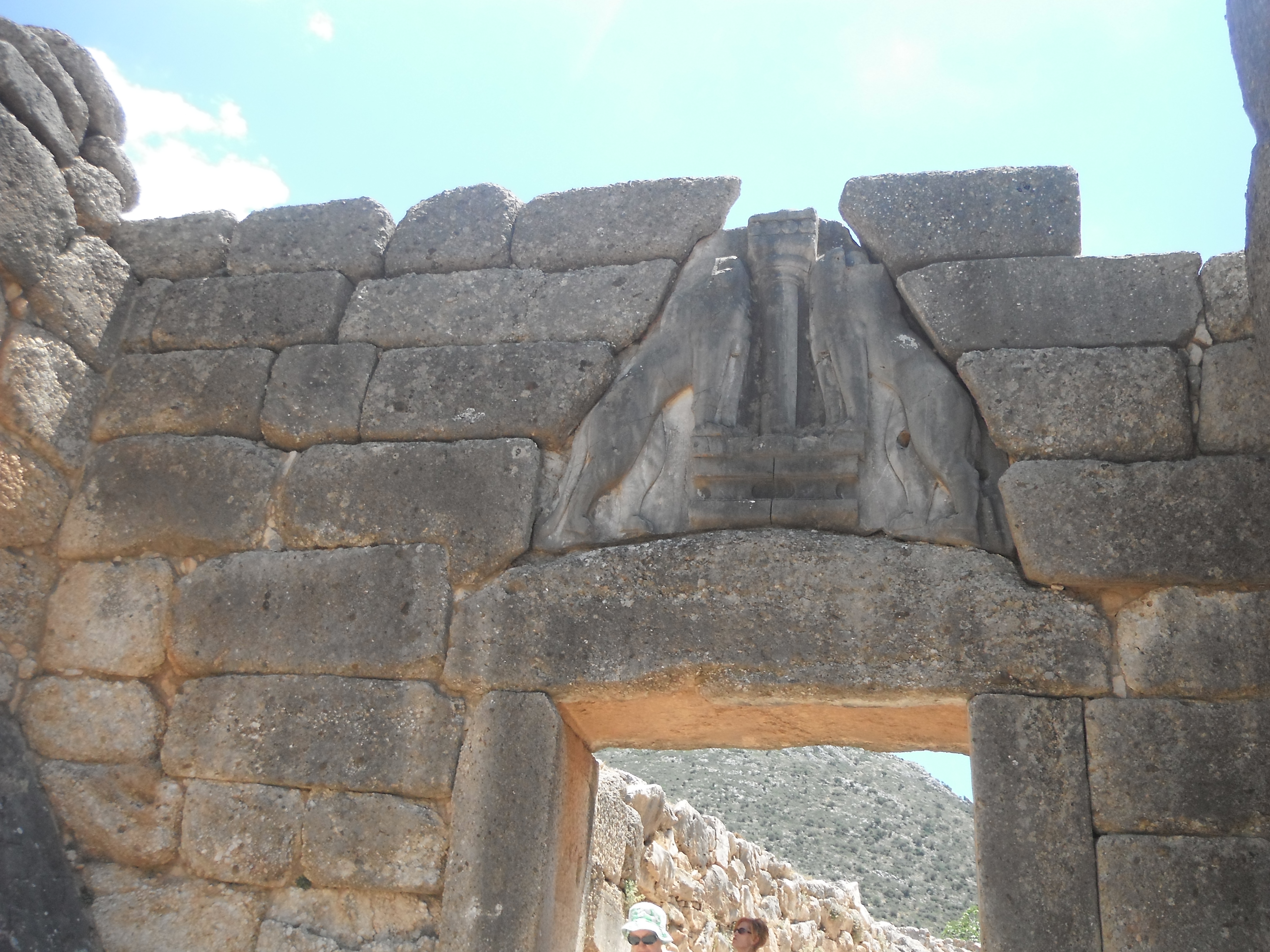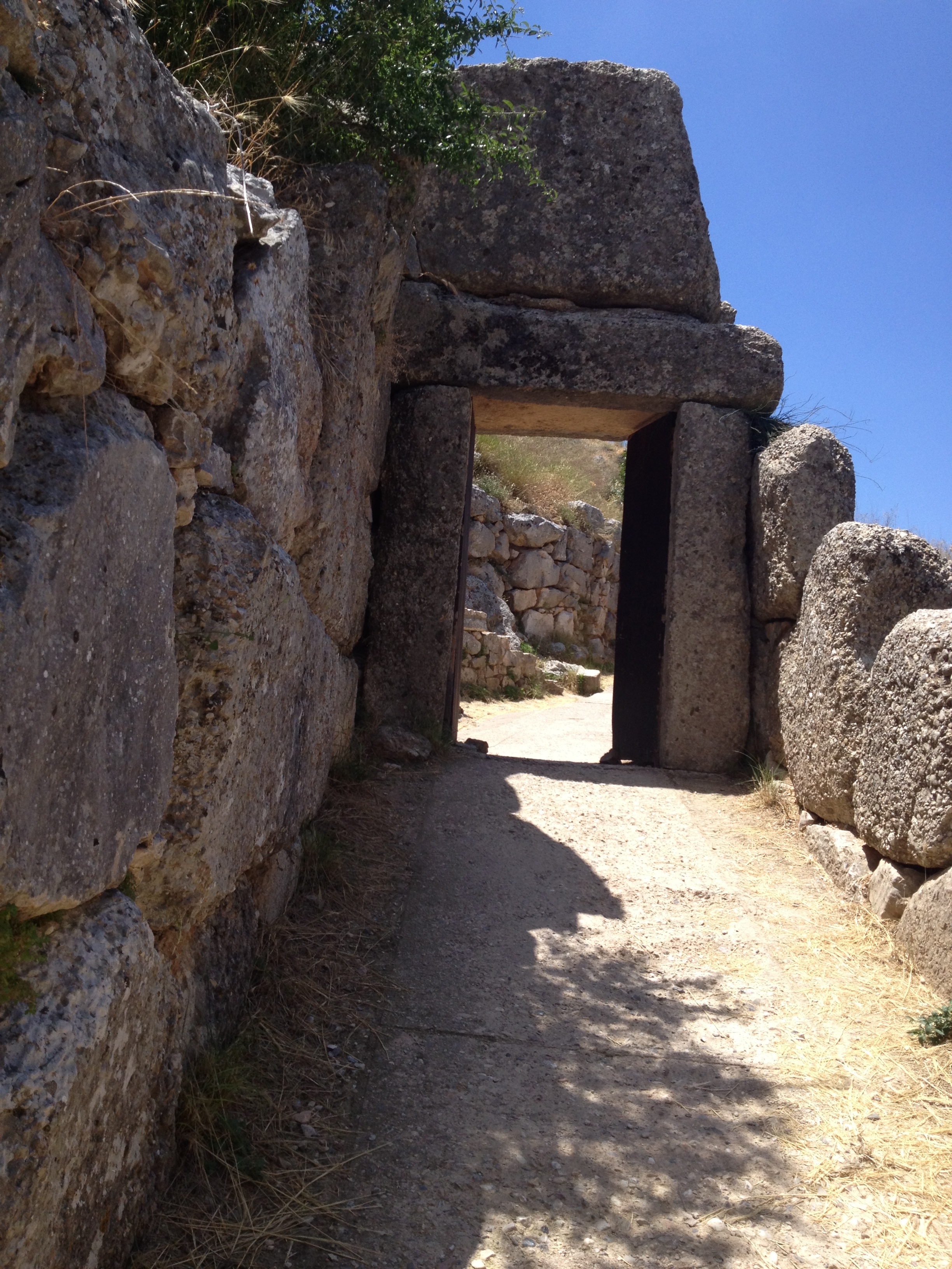Another day trip and short drive from our bungalow, is the ancient site of Mycenae, which Ingrid and Jorgos have been very adamant about our visiting! I think they think we are lazy, but that is probably due to the fact that most their guests only have a week to see everything and we have had the luxury of stretching out our tours. I suppose if we were extremely ambitious, we would have seen Olympia and Sparta by now, but we all have truly enjoyed just sitting with new friends playing UNO and getting to know the Greek people… So, today is sweltering hot and just perfect for venturing out and experiencing some more sites! Sunscreen? Check! Vineyards dot the landscape surrounding Mycenae as well as various archaeological sites where travelers can pull off and walk around. Ingrid kindly provided us with a flashlight as we set out saying, “You need a torch when you go into The Tomb or you will break your neck!”